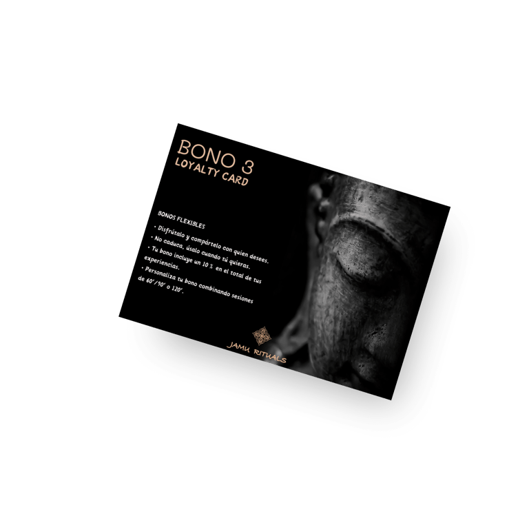 Al crear tu bono, puedes elegir entre 3, 5 o 10 sesiones, o personalizarlo seleccionando el número de sesiones que mejor se adapte a ti, con un mínimo de 3 y un máximo de 15 sesiones. La duración de las sesiones se define en el formulario, en el apartado "tiempos de las sesiones", puedes elegir entre 30, 60 o 90 minutos, o combinarlas según tus necesidades, (por ejemplo, 3 sesiones de 60' y 2 sesiones de 90') creando una experiencia totalmente a medida de tus necesidades.